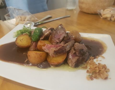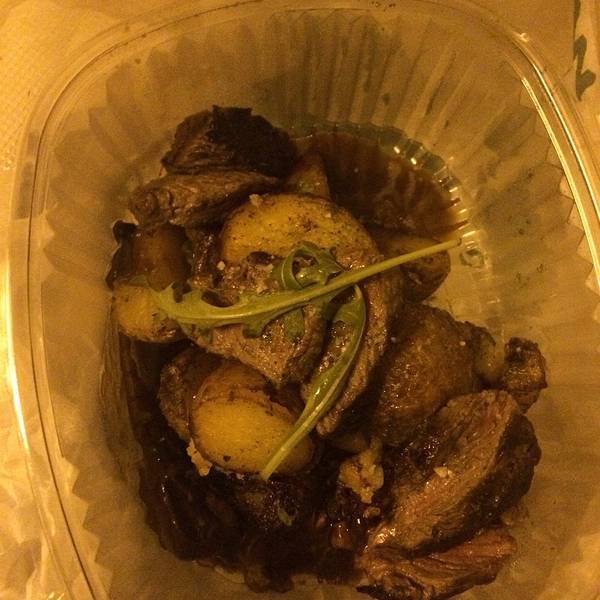 青旅前台MM给我推荐的餐厅,La Brunilda,说是当地中等价位的餐厅,有点小贵,晚上九点钟到那边要排很久的队,问了在一边等的亚洲脸怎么知道这家餐厅的,说是网上推荐的。灵机一动问服务员姐姐能不能打包,对方说一般我们是不打包的,但是可以的超级好,还要了sherry酒,问我是要甜的还是另一个,另一个我没听懂,我就说甜的吧,对方估计另一个我没听懂于是各给我倒了一些让我尝尝,还是甜的好喝,有种枣蜜的味道,超喜欢这种味道,于是菜单里最贵的一人份的牛肉加上一杯sherry,8欧,这已经是有点小贵的餐厅了好为塞维利亚人心疼这样的物价你们怎么存钱休假啊,前台MM说去年塞维利亚的夏天五十几度,正常时候四十几度,基本都不上班了,每年还要浪费两个月躺着歇着