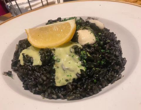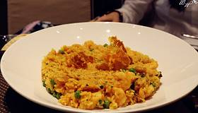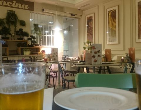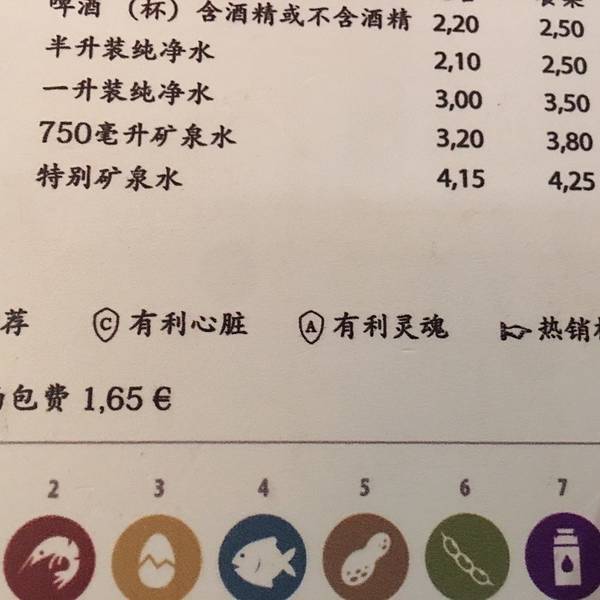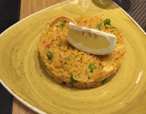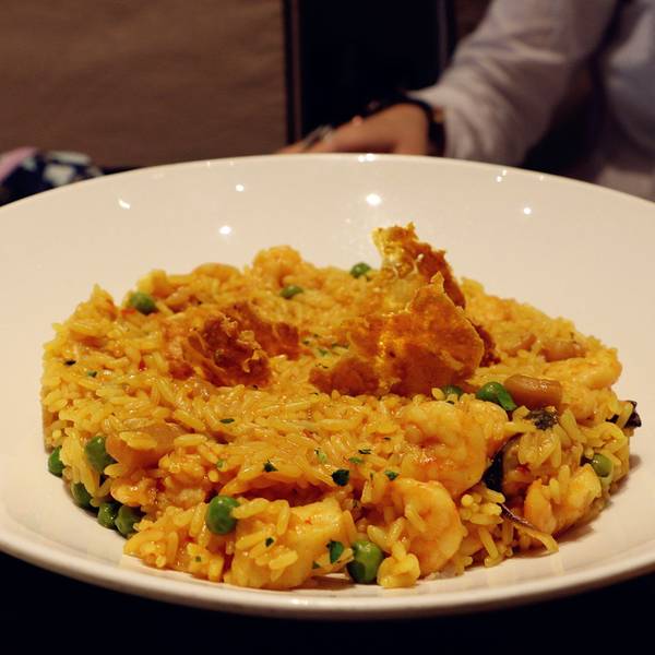 这家店就在教堂旁边,因为当天吃完饭我们要去看弗拉明戈,所以找了一家附近的口碑还不错的餐厅。餐厅门外有很显眼的中文“欢迎光临”,可想而知中文菜单就在不远处挥手了。因为门口贴着“米其林推荐”,所以期待很高。果然,有中文菜单……有利心脏我懂,这有利灵魂是几个意思?吃个饭我还洗心革面了?另外大家注意,这家要收面包费,而且吧台和其它座位的消费是不一样的,吧台更便宜,落座前注意。食物的味道中规中矩,我点了海鲜饭,有点小失望,因为分量少而且有点冷,不像之前吃的海鲜饭一大盆上来热气腾腾,恨不得咕嘟咕嘟冒着诱惑的泡泡。在我看来,这种因食物产生的幸福感是海鲜饭重要的一部分……忘记翔哥点了什么,但味道应该是还可以。