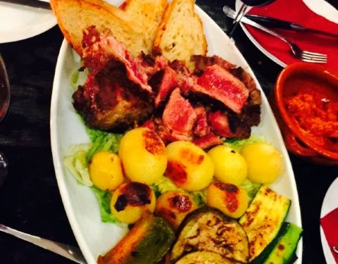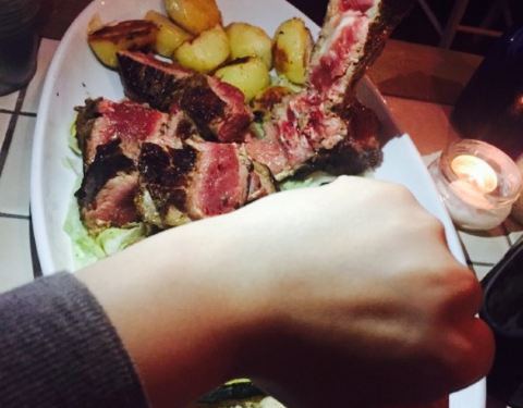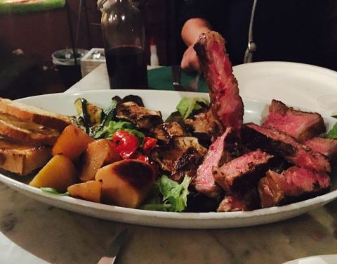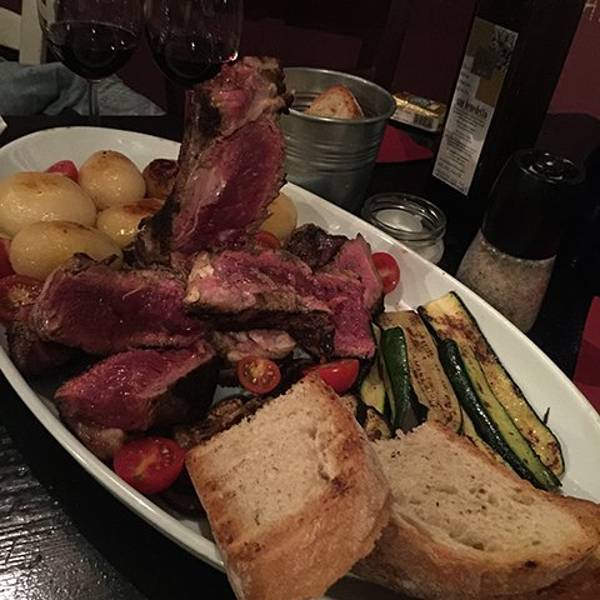 专门来吃佛罗伦萨大牛排的,餐厅的场景是类似于一个地窖,灯光灰暗,烛光闪闪,让顾客很有氛围,我们两人点了一份T骨大牛排双人套餐,一共70欧,而且分量特别足,我们选择的是五分熟,外层全熟,内层泛红,这样的...专门来吃佛罗伦萨大牛排的,餐厅的场景是类似于一个地窖,灯光灰暗,烛光闪闪,让顾客很有氛围,我们两人点了一份T骨大牛排双人套餐,一共70欧,而且分量特别足,我们选择的是五分熟,外层全熟,内层泛红,这样的熟度刚刚好,不会太老也不会嚼不动,原汁原味的烤牛肉味弥漫在口中,是一个值得推荐的店。