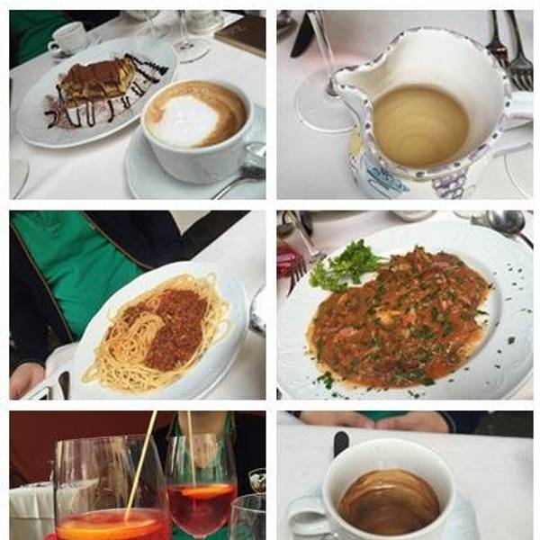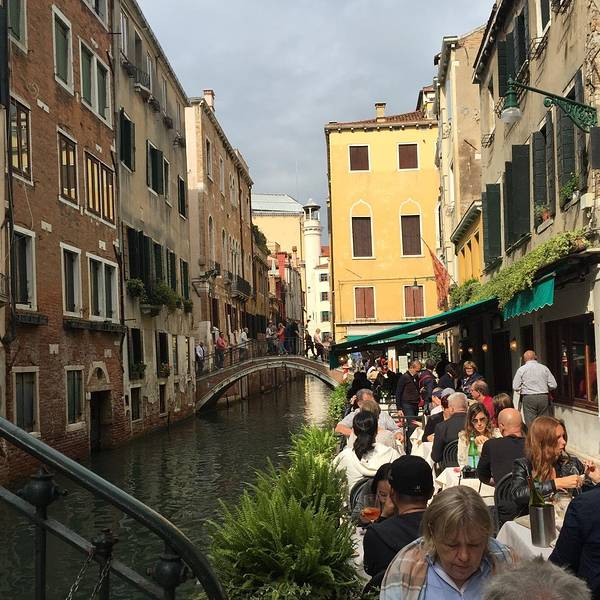 威尼斯这个地方也算是寸土寸金了,所有店面都小小的。 最划算的莫过于“take away”了,或者是那种没有椅子,给个小桌子站着吃的。 其次就是略微有一些桌子,可以拥拥挤挤这么吃饭的店面。 最贵自然就是各种沿河,可以边看风景,边吃饭的店了。 而老孙就带我来了一个逼格满满,他吃了好多次的店,Da Raffaele 整个长长的通道均为这家饭店的外延,时不时还有刚朵拉划过去。刚朵拉上的船夫唱着听不懂歌词的歌曲,饭店里的服务员也哼着不知为何的调子,这应该就是沿河饭店巨贵,不一定好吃,还人潮巨多的原因吧。
