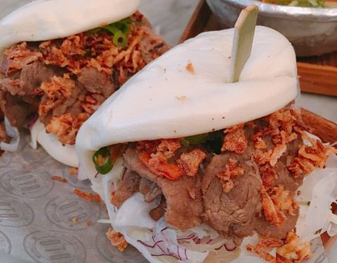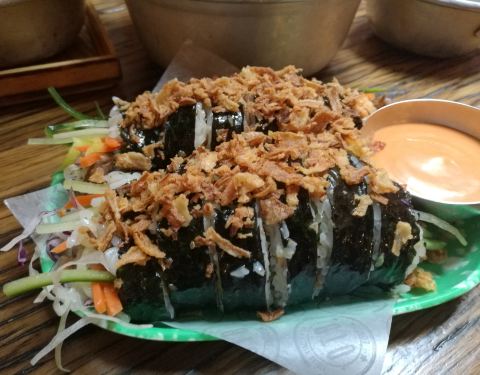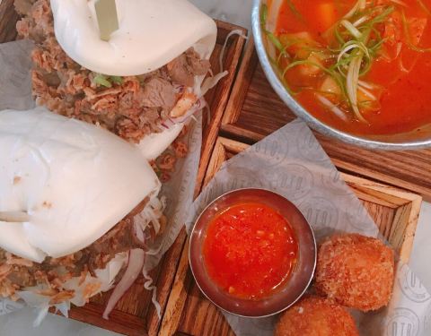 Recommand the big kimbap ( burrito ) and the friend chicken. 4 differents sauces. The red sauce is not even spicy. The best are the mayo and the spring onions one. The bao seems big but half of cabage