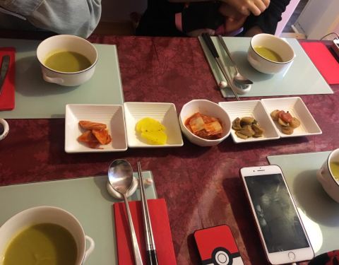 是真的很mini,座位有点挤,蓝色小门脸,里面坐得满满的,为了口吃我们咬牙在门口冻好久,还好等的值了。忘记菜名了,在国外吃到米饭好开心,配上小火锅。最喜欢炒蘑菇,撒一层芝麻特别香。爱吃泡菜的必点泡菜饼而且好大四个人吃到撑。老板特别逗,一直说什么江南style,然后确实给我们表演了一下江南style吃五花肉,把生菜肉片泡菜夹到一起告诉我们要一起吃。。差点以为他要原地尬舞。。