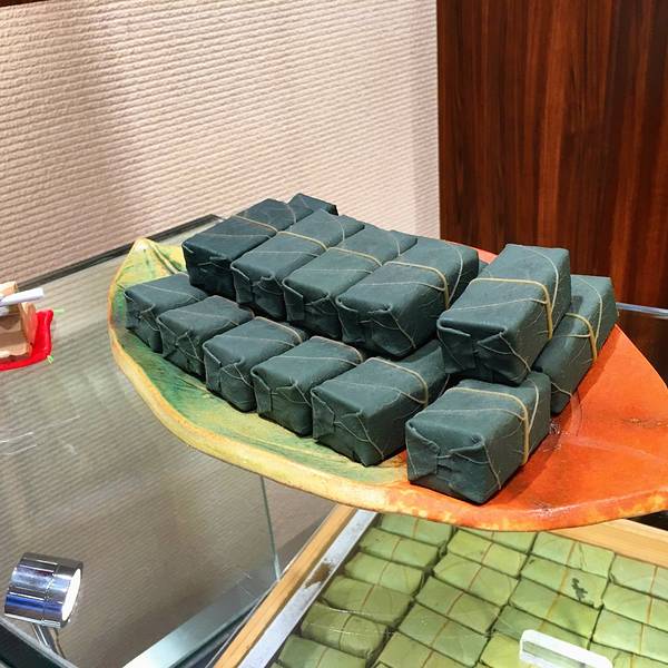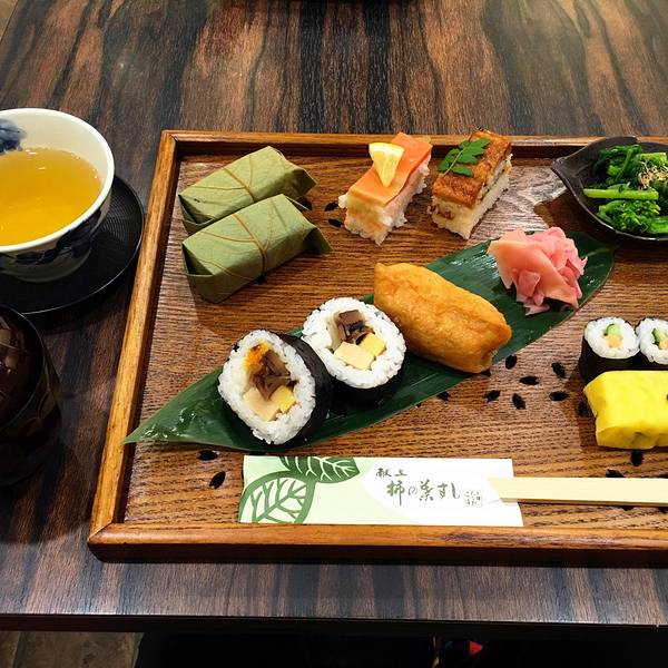 奈良最出名的美食当属柿叶寿司,餐厅主打柿叶寿司,开在奈良近铁附近。这家虽然主要是外卖,但店内后方设有一张桌子,可以买了之后坐在里面吃,店员还会送上热茶。招牌的柿叶寿司是用柿叶把寿司包起来,呈现长方形,有点类似箱寿司或押寿司。有鲷鱼、鲑鱼和鲭鱼三种柿叶寿司,入口可感受到腌渍鱼生和醋饭的风味,口感相当密实,和江户前握寿司是截然不同的风味和口感。