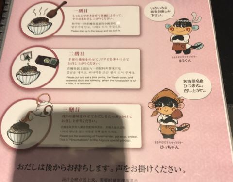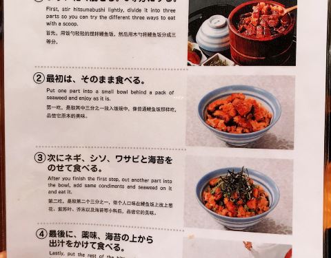 到了名古屋肯定要吃鳗鱼饭啦,正好名铁附近采购完,晚上去拔草~排队人还挺多,好在翻台子很快,毕竟主要都是来吃鳗鱼饭套餐的~ 点单完很快就上餐了,每桌都有餐牌指导鳗鱼饭三吃的吃法,还有中文版的,很贴心~...到了名古屋肯定要吃鳗鱼饭啦,正好名铁附近采购完,晚上去拔草~排队人还挺多,好在翻台子很快,毕竟主要都是来吃鳗鱼饭套餐的~ 点单完很快就上餐了,每桌都有餐牌指导鳗鱼饭三吃的吃法,还有中文版的,很贴心~ 鳗鱼饭还是很经典的,鳗鱼肥而不腻,烤的火候正好,最爱最后的茶泡饭吃法,汤汤水水的~ 这家店推荐,去名古屋必吃哦!