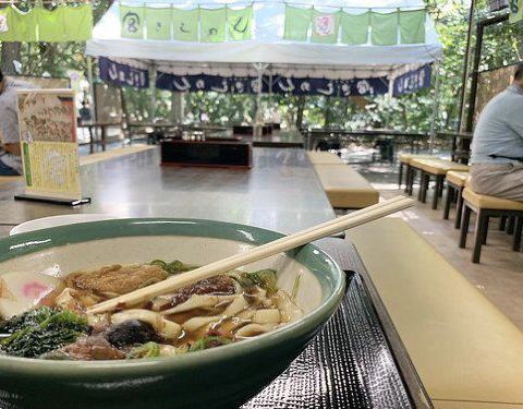这家名气很大的餐厅开在热田神宫宝物殿对面,主打名古屋的特色美食——碁子面。扁扁的面煮好后再倒入高汤,吃起来非常有弹性。因为很有人气,用餐时间光顾常常有人排队。