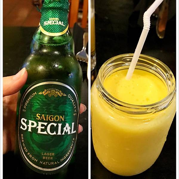 店面虽然不太起眼,但是异常火爆,需要提前一天预约才能吃到。冲着这个人气,我们预约后按点奔来。one person MIX Seafood,一人份啊一人份。幸好提前做了攻略,特意点了一人份的海鲜拼盘,上来一看两人吃妥妥还有富余,五个罐子很萌。鱿鱼头好吃,海鲜汤里面的蛏子也不错。鲜虾外面裹了一层,炸后淋上沙拉酱,口味偏甜。吃前两个感觉很好,吃到后面略有些腻了。猪排、洋葱圈、薯条。薯条好吃,吃的嗨了大概记忆力会减退,成功弄混tomato和potato,问服务员要了一回土豆酱。啤酒,越南有两种品牌是一定要尝试的:Tiger和SAIGON,据说后者味道更淡,所以更适合女生喝,但我尝起来啤酒都一个味儿……在这尝试的SAIGON。 芒果汁重点推荐,浓稠香甜,芒果足足的,喝到最后芒果的纤维丝清晰可见。