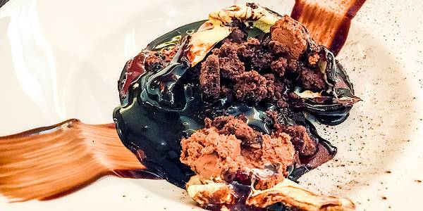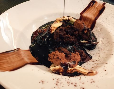餐厅正对着室内滑雪场,用餐时能欣赏雪地景色。巧克力圆顶在淋上热巧克力时瞬间融化,视觉享受大于味觉享受