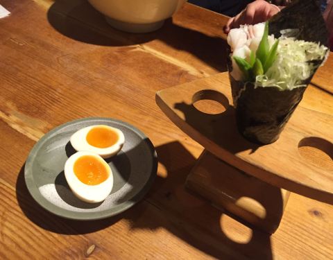 距宜兰礁溪客运站(大巴士)500米左右,温泉公园门口,拉面店户外用餐区域是在屋檐下,还可以边用餐边泡脚 拉面总是点的;倒是小菜喜欢,“芦荀虾手卷”海苔包裹着虾肉、芦荀、美奶滋(甜色拉酱),香甜新鲜,又清口;“日式炸豆腐”配酱汁咸淡适中,里面烫口要小心;“盐烤秋刀鱼”全熟、皮略焦的恰到好处,又保留汁,又是趁热吃的一道 祝店家人气旺盛、和和美美、生意兴隆