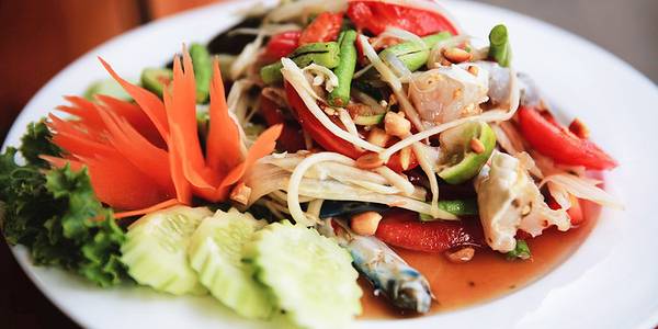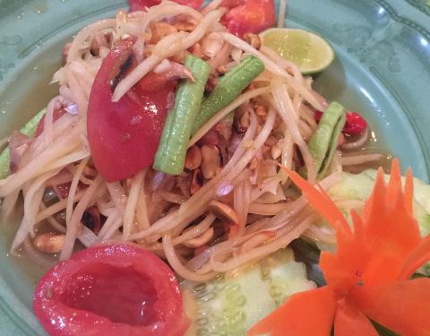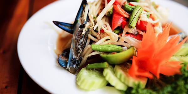 奥南海滩对面的餐厅,蓝白基调的色彩很有海岸渔家的感觉。餐厅主营东南亚菜、海鲜。酸辣生拌蟹独具特色,青木瓜丝、番茄、胡萝卜、生蟹等食材装了满满一盘,最后撒上花生芝麻,咸酸鲜辣,味足劲猛。