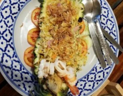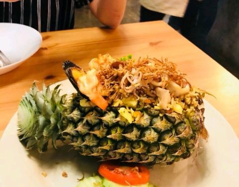 - ...的菜还是泰国菜,东西做的挺实在的,看这个菠萝饭,满满的都是料,而且海鲜给的也很多,价格也可以哦