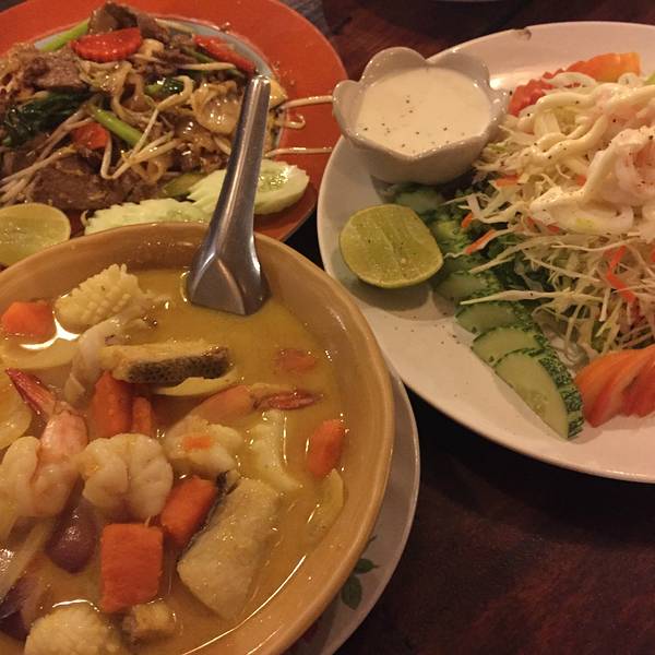 海鲜炒粉,芒果沙冰,牛肉黄咖哩。。味道都不错。我不建议吃鱼,不知道为什么东南亚很多地方的鱼又贵又不好吃。