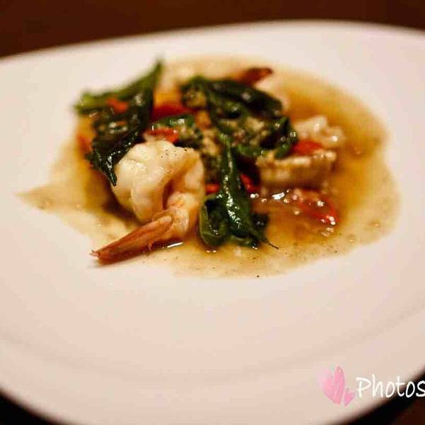 紫苏叶辣炒海鲜。同样,碟子很大,份量少得可怜。用几片紫苏叶伴着,海鲜完全没有吸收到酱汁,感觉有点像水煮后拌上去的;