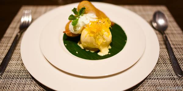 甜品,炸香蕉雪糕,虽然价格昂贵,但服务员说这是她们餐厅最特别最值得推荐的甜品,我们也尝试一下。炸熟了的香蕉还泛酸,香草雪糕口感偏甜,最特别算是那一缕缕黄色的丝丝,是用蛋黄液做的,然而还有一股姜汁味;