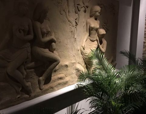 装修很豪华,绿植浮雕也不少,食物小吃也挺多的,食物出品不简单,也很注重造型的美观,摆盘漂亮,就是份量精致,用餐环境安静,服务大方有礼,而且都是帅哥美女,大饱口福眼福的。