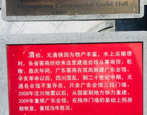 广东会馆在08年汶川地震以后,09年重建,在残存门墙的基础上照原貌恢复。 清初,因为元通镇物产丰富,水上运输便利,各省客商纷纷来这里建造会馆从事商贸。 乾隆嘉庆年间,广东客商在双凤街建广东会馆。 下午...
