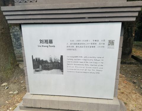 刘湘墓内,埋葬的是四川军阀刘湘,刘湘是当时独霸一方的军阀。抗日战争爆发后,刘湘全力支持抗战,为抗战提供了大量的兵员、物资。 刘湘的陵墓为长方形,前立有墓碑;碑前有一个小供桌;墓后有一石砌山墙。