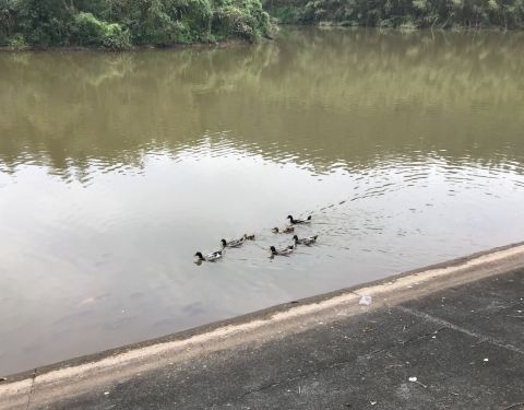 滴水岩森林公园位于番禺区北村桃源路滴水岩街,就在沙湾古镇再往里走,很方便。滴水岩森林公园前身为滴水岩鸟类自然保护区,自1997年建立保护区以来,这里就成了鸟类和野生动物的乐园。 我是周末下午四点多到达公园门口,那里横七竖八摆放了不少电动车和自行车,大门的招牌破烂不堪。走进公园,发现里面倒是焕然一新,广阔的天地令人心旷神怡。绿树成荫,露天休闲石凳点缀其中。孩子们在草坪上嬉戏或带了帐篷露营。公园有山有水,环境非常优美。顺着林间径往前走,见到了很大的荷花池,可惜荷花已凋零,只见鱼儿在池中游。继续沿着大路上走,来到了鸟类自然保护区的湖心岛,那里有个小岛,四面环水,有一群小鸭在欢快地游动。因为时间的关系,只在公园逛了很小一部分,连半山腰的水库也没有去到,就和下山的游人往回走。 下次要找个早上,有更多时间好好游一游滴水岩森林公园。