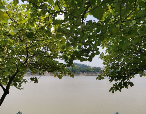 它在珠江边,有岭南风格园林,湖亭相隔,可步行可骑行