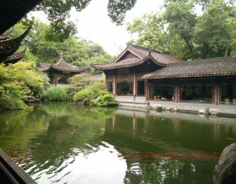 杭州魏庐位于花港观鱼的观鱼池西侧,是一个重新修善的园林建筑物,里面有一大池塘,养了很多鱼,旁边建筑物形成一圈,里面可以品茶休闲,是一个闹中取静的好地方。