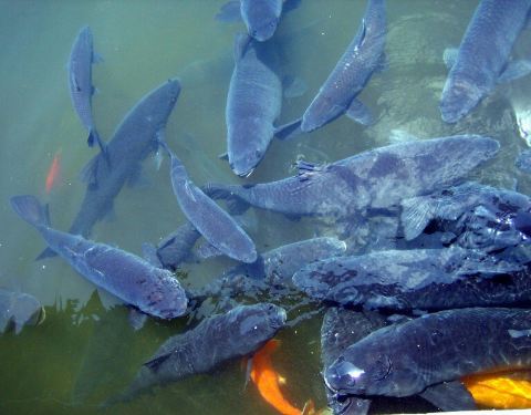 喜欢在那里看着这些大鱼悠游自在的在水里游,投喂些鱼食会马上过来争抢