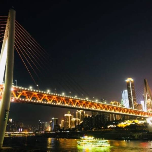 朝天门码头只是朝天门一隅,泛朝天门范围很大的,从弹子老街出来,正对着的就是朝天门长江大桥。 重庆的3D可不是自封,那是口口相传出来的。“想魔幻搞夜景”,最先看清这一点的是有着悠久不夜城历史的上海--外滩的灯光在国内无可比拟者。就灯光来说,重庆整体比上海仍有差距,但局部完全可以与之抗衡了,且细节之处颇有新意~ 整体来说,重庆设计夜景跟他们的火锅一样“浓烈雄浑、红油赤酱”--全都是重色、深色,及时极尽变化之能事,也很少用浅色进行过度,长江大桥深蓝、赤红二色的搭配真让人觉得舒适惬意暧昧,漫步于此,暖在身上痒在心里~