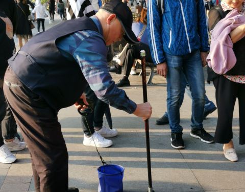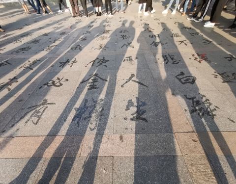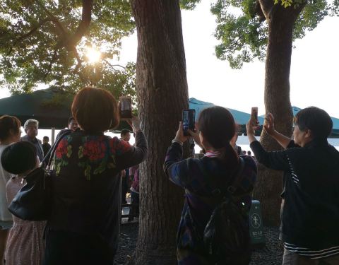 顺着西湖往北走,大至的景色都差不多,湖边的公共设施也是延续着的,到了这里又能看到一组反映淞沪战役内容的雕塑。相对来说这里比六公园的游客集中度要高一些,一是靠近西湖音乐喷泉,二是走出去就是繁华商区了。 这里的当地人不少,有跳广场舞的,有在地上写字的,更有趣的是几棵大树下围着好多人,缘由是树上可爱的小松鼠已经和游客能打成一片了。