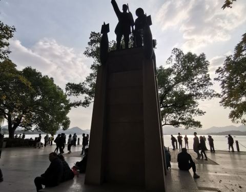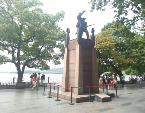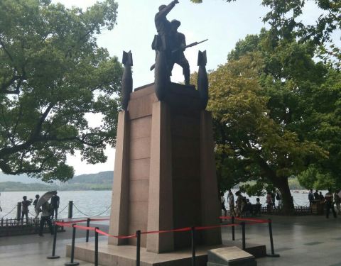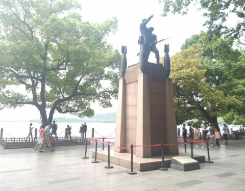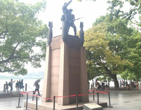 顺着西湖往北走,大至的景色都差不多,湖边的公共设施也是延续着的,到了这里又能看到一组反映淞沪战役内容的雕塑。相对来说这里比六公园的游客集中度要高一些,一是靠近西湖音乐喷泉,二是走出去就是繁华商区了...