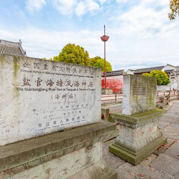 海宁盐官旅游度假区位于海宁盐官镇钱塘江畔,景区大致可分为盐官古镇和观潮胜地公园两部分,来到盐官的游客大多是冲着钱塘潮而来,潮水一般是下午,因此上午等潮水的时候正好在古镇逛逛。若只是在古镇逛逛,不进宅院便不用购票,若要去观潮胜地公园看潮水,可单买公园门票,也可直接购买景区联票。从游客服务中心进入景区,从春熙门往里走,联票中的收费景点大多集中在这里,步行距离很近。除了这些景点,值得一看的还有春熙路上的海神庙,关于海神庙的传说很多,让人印象深刻的要数梁柱上的彩绘,门口的石狮子也是古物,金庸书院也在它附近,“飞雪连天射白鹿,笑书神侠倚碧鸳”一首诗句,完整地记录了金庸先生的15部作品,书院也是金庸先生亲自参加奠基建设,建筑和布展体现了侠士的情怀。甬道壁画品武侠,书剑堂上话江湖,藏书楼里读金庸,望云亭上看风云。另一个收费景点王国维故居离其它景点略远,是学术界的知识探索之地。故居是王国维九岁时,其父亲王乃誉所建,当时名为“娱庐”,“国学大师”王国维在此度过了青少年时代的十二个春秋,后仍每年回来小住,王国维称其为“西城小屋”。里面陈列了一些王国维的生平资料,位置不太好找。另外,还有不能错过的就是孔庙学宫,它占地12800多平方米。可分为前导、左学、右庙等三部分。前导部分包括照壁、泮池、魁星阁、节孝祠等;左学部分包括儒学门、仪门、明伦堂、敬一亭和尊经阁等,右庙部分包括棂星门、大成门、大成殿和崇圣祠等。这里是儒家学术和古代教育的重要展示地,同时也结合了海宁地方文化的展示。在人民路口左转,走到尽头便是观潮胜地公园,公园里有好几处观潮点,还有占鳌塔、观潮台之类的古迹和一些展览。钱塘江观潮的习俗至今已有两千多年历史,如今大缺口、盐官和老盐仓三个观潮点尤为著名。观潮胜地公园是看“一线潮”的好去处,平常每月农历初一、十五左右,潮头会在这里呈一道白色水线,以惊人的速度奔向堤岸。随着白线的逐渐升高,潮头好像一排锐不可当的白墙,气势磅礴非常好看。尤其是在农历八月十八观潮节时,来此观潮的人潮一点也不输给江潮,此时公园门票和周边的住宿不仅价格疯涨,而且供不应求。每天潮汛的具体时间不太一样,建议行前咨询景区,或者直接问问景区周边的小商贩。景区内的乾隆酒楼、元龙食府可以用餐。