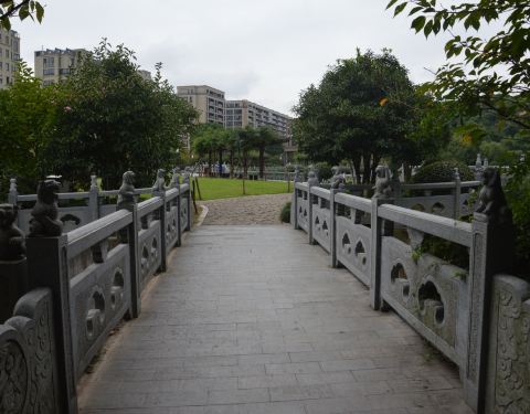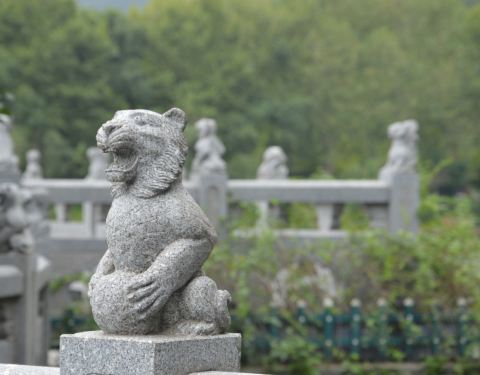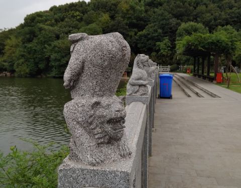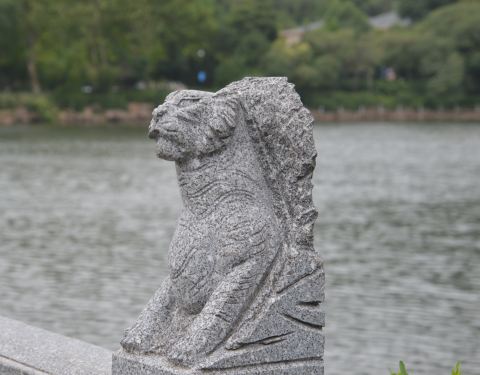 这里风景也不错,有山有水,楼亭阁榭都有,一步一景,惟妙惟肖。最有趣的就是栏杆一顺溜的石刻老虎雕塑了