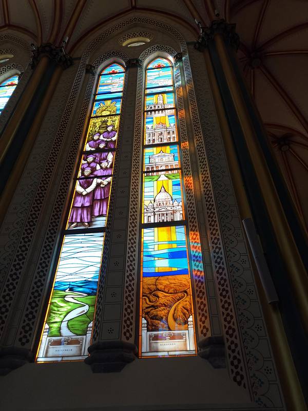 两旁的彩绘玻璃非常漂亮,就是当时阳光还没有照过来,不然阳光照耀下会更漂亮 教堂一侧