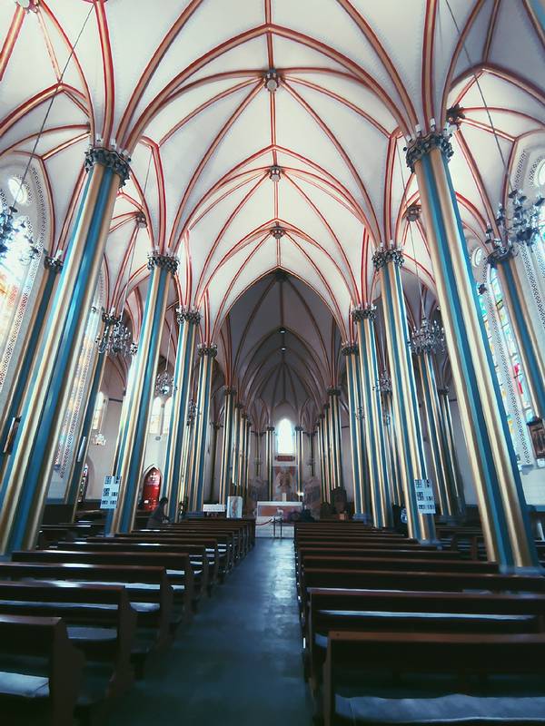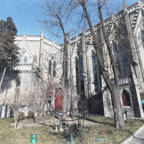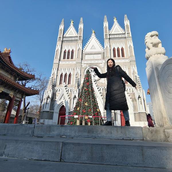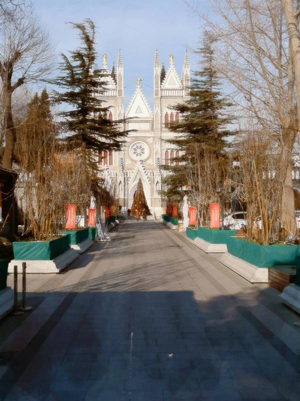 打乱计划之后,正好看到附近有西什库教堂,在电视机剧里经常听到的地方,比如说《大宅门》本人是这部剧的忠实观众,复刷次数已经不计了,反正电视上有播出的话我就肯定会看。 经过很长一段路,不过路上真的是很舒服,阳光暖暖的,边走边看,我还抱怨自己穿多了,有点热,早知道也穿件大衣等着美美哒照片了,现在穿的胖乎乎的,但是不像球,我室友说我像根加粗的黑筷子,我觉得还是圆点可爱。路边随手拍到的,感觉和周围格格不入,所以印象深刻旁边有北大口腔医院,门面不算太大,石砖样式,民国时期的感觉,一跨进大门,就能看见哥特式三层的教堂,整体呈白色,路两边还种着四季长青的树,走进可以看到两边还有两个中式黄色琉璃瓦顶的亭子,中西结合。滤镜用过头了,凑合看吧当时已经临近圣诞节,所以教堂里也装饰起来了,教堂前面中间放了一棵巨大的圣诞树,周围也是。道路一旁的草坪上,感觉很有童趣。当时正面的人很多,所以我们绕道左侧,近距离观察这座教堂,几乎没人,前面放着牌子,我们也不好在向前走,就原地拍照。教堂一侧我们还在纠结到底能不能进,后来发现那个侧门一直有人进出,我们也就大着胆子进去了,室友的温馨提示,我摘掉了帽子。 进去之后,非常安静,只有零星几个人在拍照,地方很大,一排排的椅子,我都可以想象到做礼拜的盛况了,鼻尖可以轻微闻到一点腐朽的气息,感觉真的是很久远了。 屋顶很有特色,圆拱形,又都汇聚到了主道的两排柱子上,红黄边缘勾勒,整体是乳白色,柱子是黄绿相间的圆柱组合起来似的,非常有棱角。两旁的彩绘玻璃非常漂亮,就是当时阳光还没有照过来,不然阳光照耀下会更漂亮从教堂里出来,我们又来到外面,准备拍照,话说一直都有看到师傅搭着梯子在描补,大概是为了圣诞节做准备吧。沙雕室友为我拍的沙雕照片