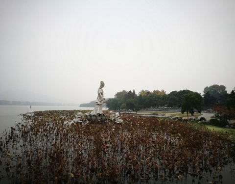 在玄武湖环洲上靠近梁洲的一侧有一个莲花广场,这里水面上种满了莲花,在莲花丛中矗立着一个莲花仙子,这个仙子由洁白的花岗岩石雕子。