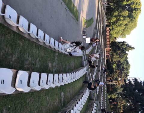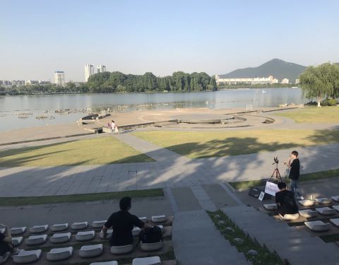 傍晚散步到玄武湖的中心地方,整好休息一下。一块比较平整的场地,有观众的白色座位,写着可以容纳3000人。一个男孩在场地直播唱歌,听着音乐休息好的,后面唱的就一般了。应该是晚上有喷泉吧,看到了喷泉的空隙。