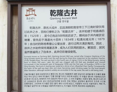 1、高淳老街西端的街口前行不远左转几十步即是“乾隆古井”,乾隆古井始建于明嘉靖四年(1525年),已有近500年的历史,井口直径0.55米,原井深三丈,现井深6.3米。 2、高淳县志记载,明嘉靖二年(1523年),天大旱,数月无雨,溪河涸竭,湖底龟裂,可行人走车。翌年,又大旱,百姓饮水十分困难。时任高淳知县刘启东为解饮水之难,发动全县百姓在学宫东书屋的南侧开挖水井,昼夜奋战,半月有余,终于挖掘砌成一口深达五丈的水井。因为施工顺利,大功告成,刘启东高兴之下,便将该井命名为大成井。 3、期间由于井内被淤泥堵塞,曾分别于清道光十四年三月(1834年)和清光绪元年(1879年)由当时的希彻公公堂出资,先后进行过两次清淤掏挖。因此,该井之水始终保持清澈洁净,成为人们饮用的佳品。 4、1975年开展群众性爱国卫生运动,由县城镇建设部门投资对此井进行了清淤和重修。后来由于居民普遍用了自来水,此井才略微清静,但用井水的人依然不少。三九寒冬井水温暖,人们到这里淘米洗菜;酷热夏季,尽管有空调冰箱,人们还是喜欢用井水冰镇瓜果防暑降温。5、相传乾隆帝三下江南时,曾游历高淳,被高淳的湖光山色、水乡风情所感染,欣然写下“江南圣地”。乾隆畅饮青山绿茶时赞不绝口,问知县:茶出青山,水出大成井,井在何处?知县回禀:仅百步之距。乾隆爷便来到大成井边,提桶吊水,喝了两口,连说好水,并双手伸进桶里擦洗了一会儿。这消息迅速传遍县城,也传到附近的十里八村,人们都想一尝乾隆爷喝过的井水是啥滋味。一时间,大成井边排起了长龙,年久日长,井圈上竟然留下了道道绳槽。不知何时何人由此便把大成井改名为乾隆井。 6、改革开放后,乾隆古井更成了老街一处发人思古的景点,古井成就了高淳老街,老街也因古井而闻名遐迩。
