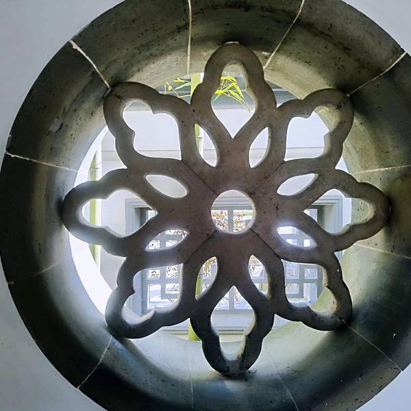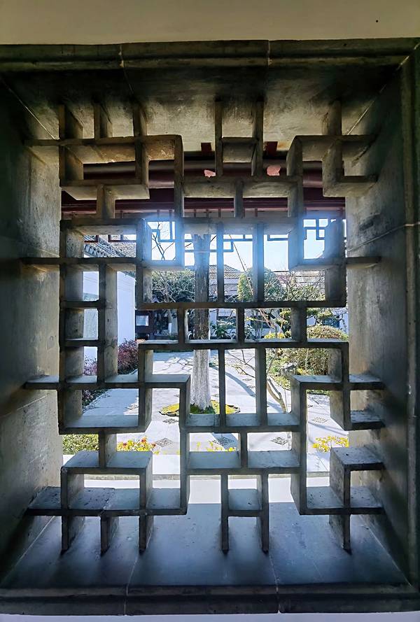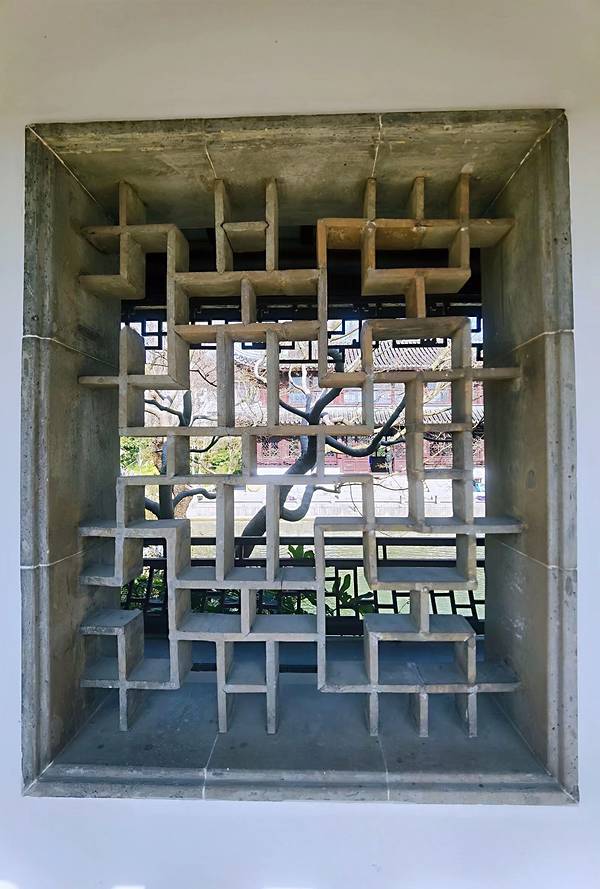 一座园林,就像一幅画,如果没有漏窗,总觉得精、气、神缺少了点什么,站在园内的漏窗前,漏窗内的绿草碧树、花坛石峰、通幽曲径虚虚实实、影影约约,渲染了一种扑朔迷离的神秘,不由得生出了迫切的心情,想探寻其中的奥妙;园内东面的院墙,有两扇漏窗套漏窗的设计,很是巧妙,每扇漏窗内的景色各自不同,画中有景,景中有韵,让整座园林一下子就有了妙趣,透过漏窗,好像窥见了整座园林的灵魂一样,李渔所说的“尺幅窗,无心画”的境界,通过这一扇扇虚空的漏窗,给人们带来了一种深远无尽的想象。