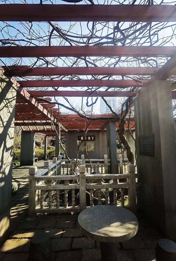 “古藤园”的主角,当然是紫藤了!说起这棵紫藤,可是有故事的。 这棵紫藤的所在地,过去叫“紫藤棚”,以紫藤为中心,形成了一条东西走向的小街,街面上架棚,紫藤浓荫如盖,延绵了大半条街,整条小街有烟杂店、咸肉庄、鲜肉摊、碾米厂、南北什货店等商店十多家,河东、河西还有关帝庙、筑耶城庙,紫藤树下是一家茶馆,是当时最热闹的一处聚众的地方。《上海县志》有记载这棵紫藤的气势:“今犹生气盎然,花时香气蓊郁,冠盖半街,远望如天半紫霞。” 这棵紫藤相传是明代嘉靖年间诗人董宜阳亲手种植的,所以后人把这棵紫藤尊称为“宜阳古藤”,近500余年的沧海桑田,当地民间至今还流传着有关这棵紫藤的两则传说:一则是清乾隆皇帝下江南时,在此短暂停留,曾把马拴在了这棵紫藤树上,二则是太平天国时期,紫藤被一场大火烧坏,直到辛亥革命前夕,枯萎的紫藤才重新吐青,恢复生机。 为保护这株上海最古老的紫藤,上世纪90年代,兴建了“古藤园”,原来的小街消失了,一棵树长成了一座公园,生机勃勃的“古藤园”,如今成了当地的一道风景线。 现在的紫藤一点动静都没有,连爆青的痕迹也没有,不过,紫藤开花的时节不远了,一般在每年的四月下旬,是紫藤绽放的最佳节点,到时候,踏青、赏花、春游、打卡,再去探探这棵上海滩上最古老的紫藤开花的盛景。