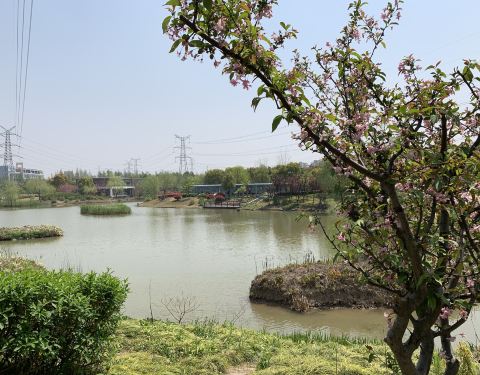 在张江路东面,川杨河北面,天气好的时候,公园里的人特别多,有跑步的,遛娃的,春天来了,公园的花都开了