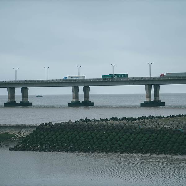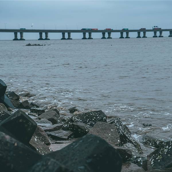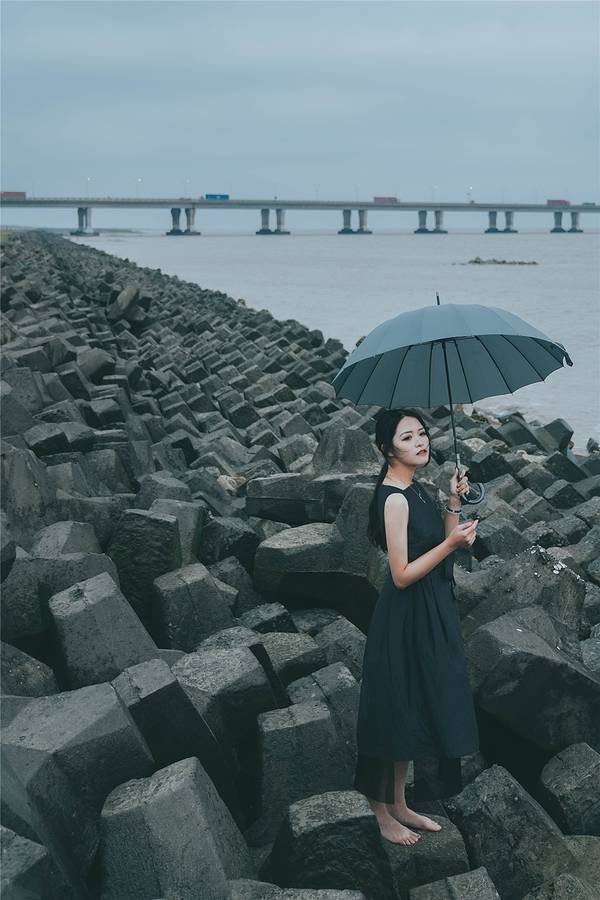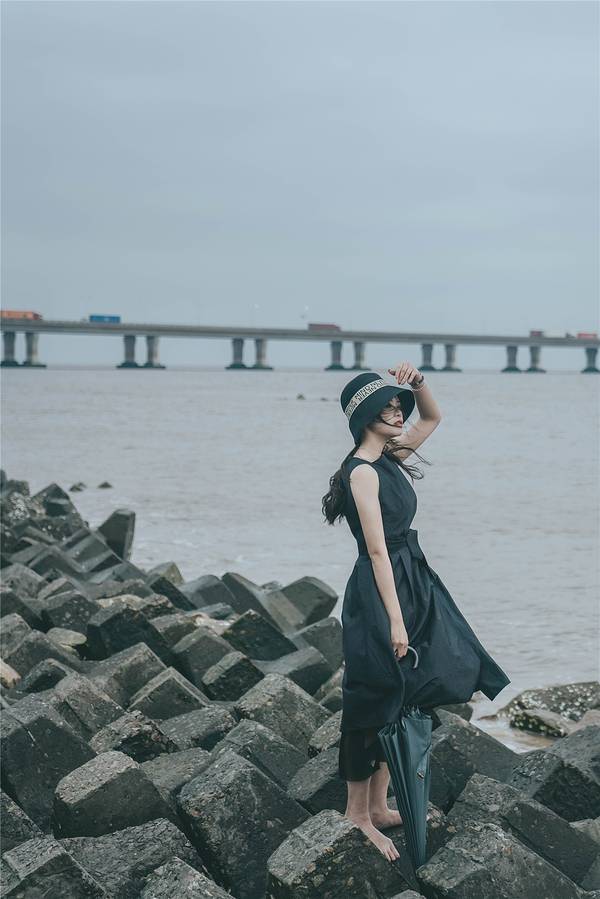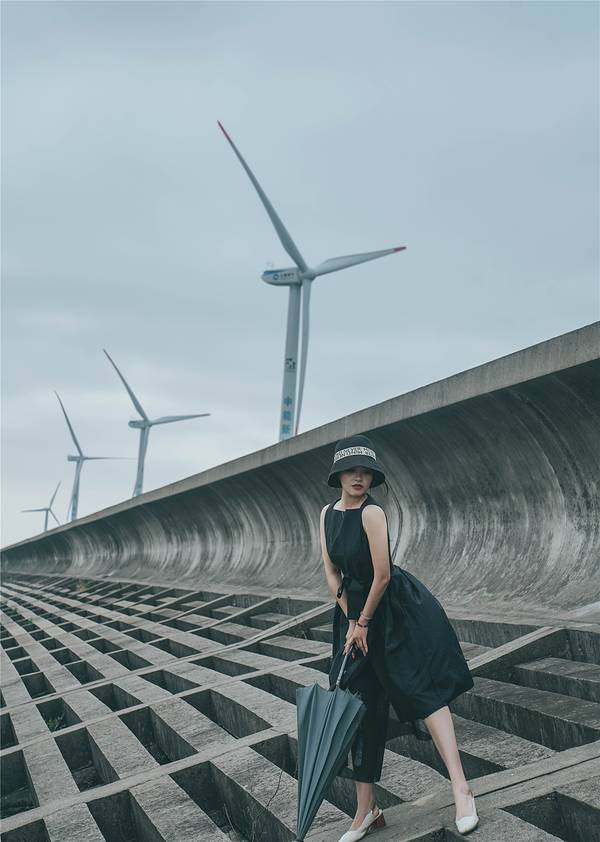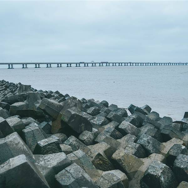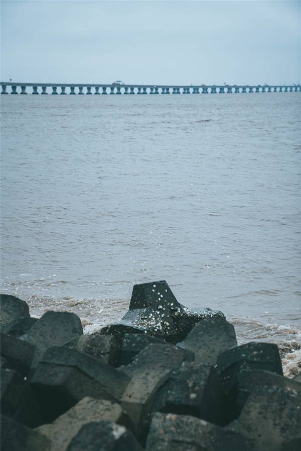 向着上海的东边驶去,逐渐远离繁华的魔都市区,高楼大厦被取而代之,逐渐开阔的视野让心情也变得明媚。这个季节的上海,虽然天气预报有着二十多度的气温,但是早晚的温差仍然很大,一早出门时还以为是最冷的温度了,谁知到了滴水湖风车湾的时候,才发现有过之而无不及。滴水湖风车湾沿着海岸线分布,长长的一条海堤小路,望不到尽头一般,一边是往海岸,一边是往大片的油菜花田。一打开车门,从海面上刮来的风咻咻地往车厢里钻,花田上伫立着的大风车被风吹得一圈又一圈地转动。大概正是看中了近海的大海风,才会建造这一片风车湾,还是第一次这么近距离地看到伫立在眼前的大风车,站在风车底下一瞬间觉得自己变成了小矮人,而一个个在海堤路旁排列的大风车,则像是驻守的巨人士兵。从海堤路走下海岸边,芦苇被裁剪掉枝头那一截,光秃秃的一片迎着肆虐的海风,海岸边堆垒起一排排人工礁石,经过日复一日的海水浸泡,长出了一层青苔一样滑溜溜的东西,有的表面还附着着各种贝类生物。海水在海风的吹动下,一层接一层的海浪拍打着海岸,溅出星星点点的水花。远处的东海大桥横跨在海面向远方延伸,长长的白色桥梁仿佛看不到尽头,桥上陆续行驶而过的车辆只隐隐约约看到半个身影,呼啸着向东边驶去。