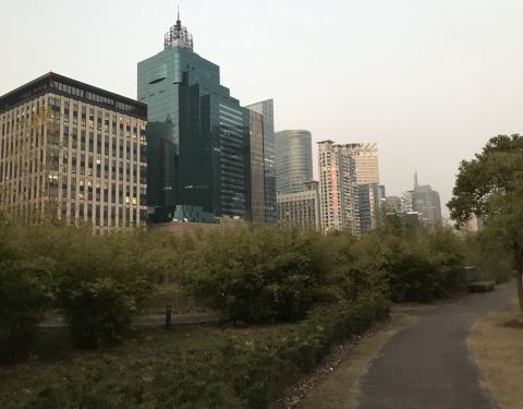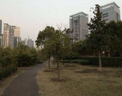 浦电路地铁站上来,蛮大的一片绿地。其中一角,弯弯曲曲的小径都是绕在竹林之中。种了那么片竹林和竹园是非常应景。到了夜里,周围陆家嘴软件园的高楼开起灯来,远处的上海中心也清晰可辨。算是一个替高楼来吸霾的地方。景色一般。