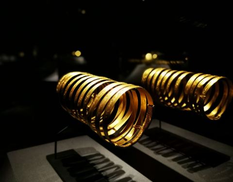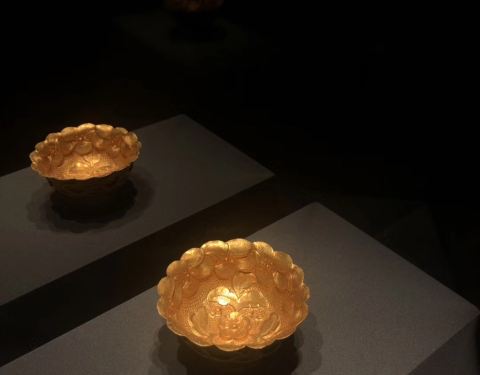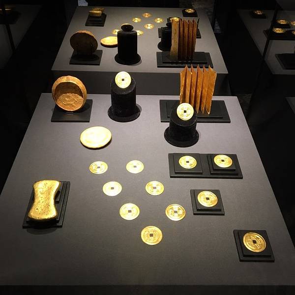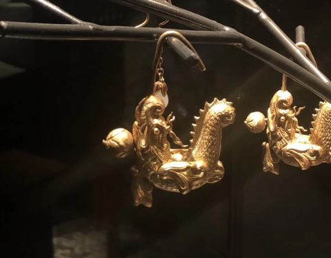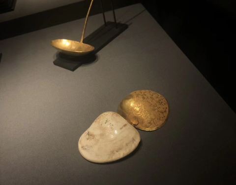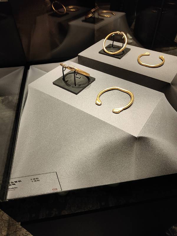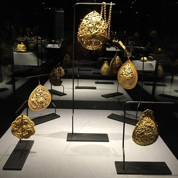 下一个是金子,对这些的确没有很多了解,就觉得馆的布置真是很豪华,黑色的布景,满眼金器。从2世纪到明清时期的都有,看不出好坏,就有几个捶揲的看上去不错。