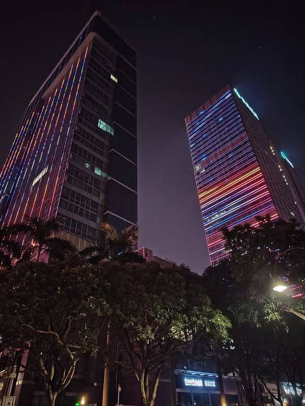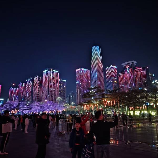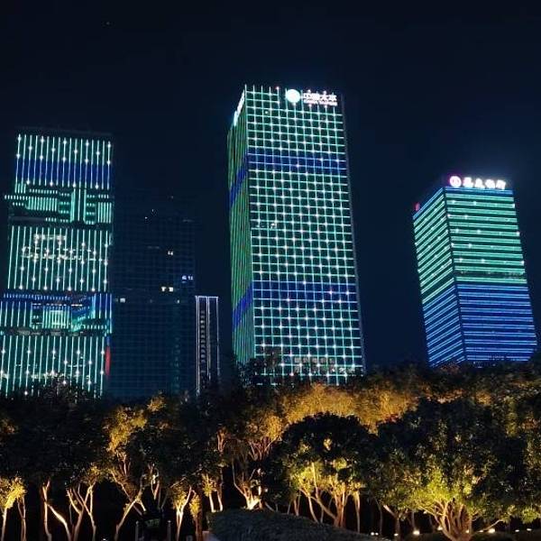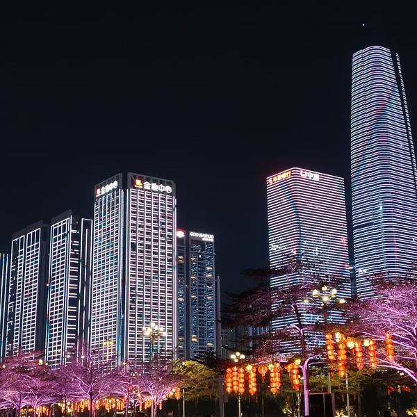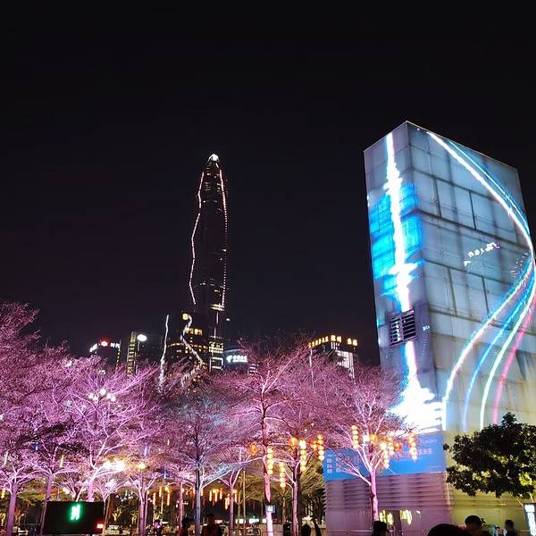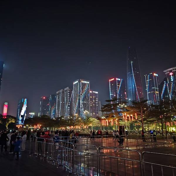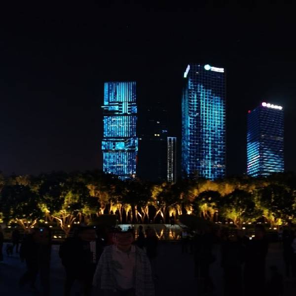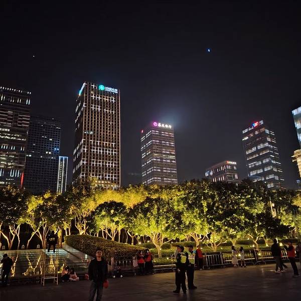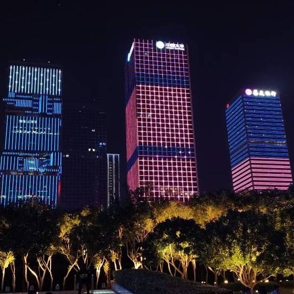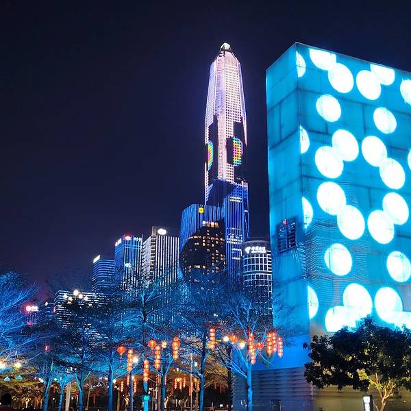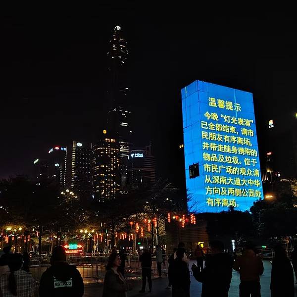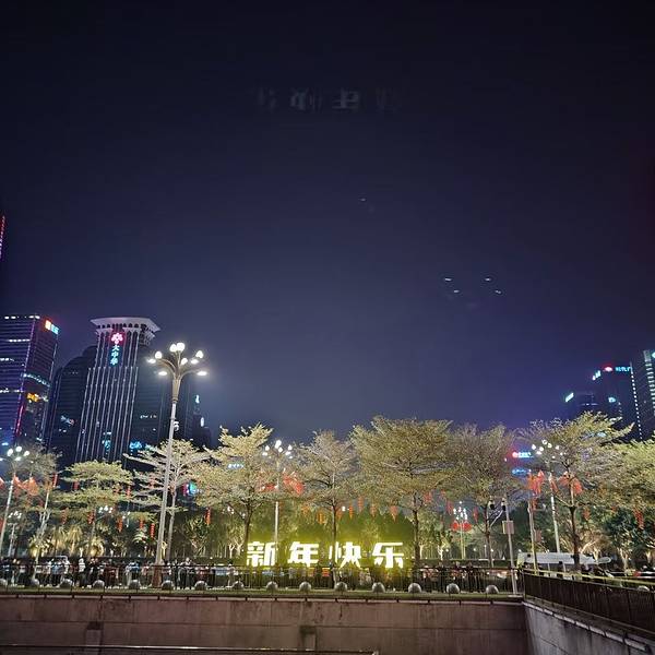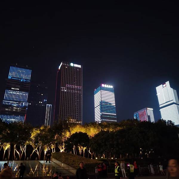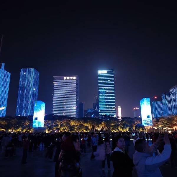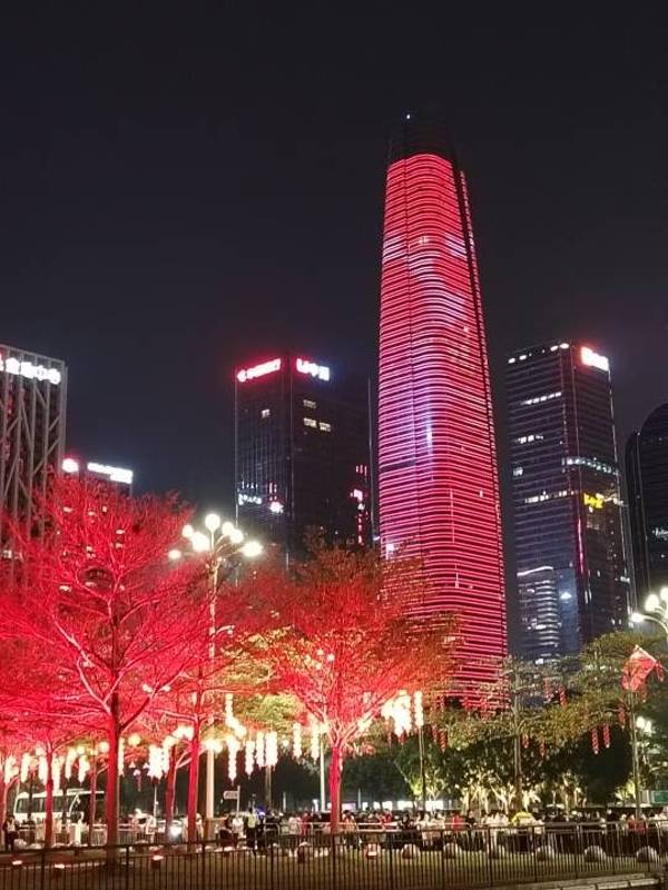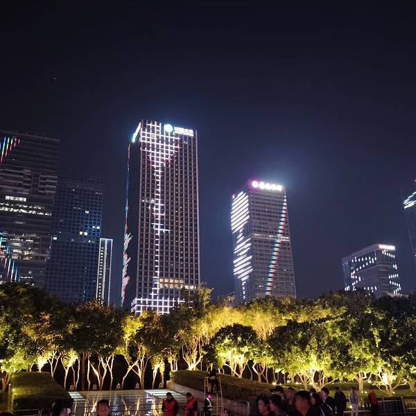 一场灯光秀20分钟左右,看得好过瘾。结束后,有广场和大屏幕提醒大家有序离场,虽然人很多,但是确实很有秩序,这时,深圳市民广场周围的树就成了亮点了。