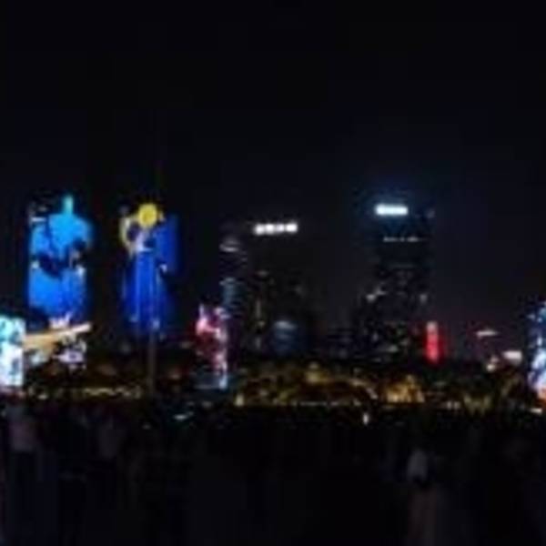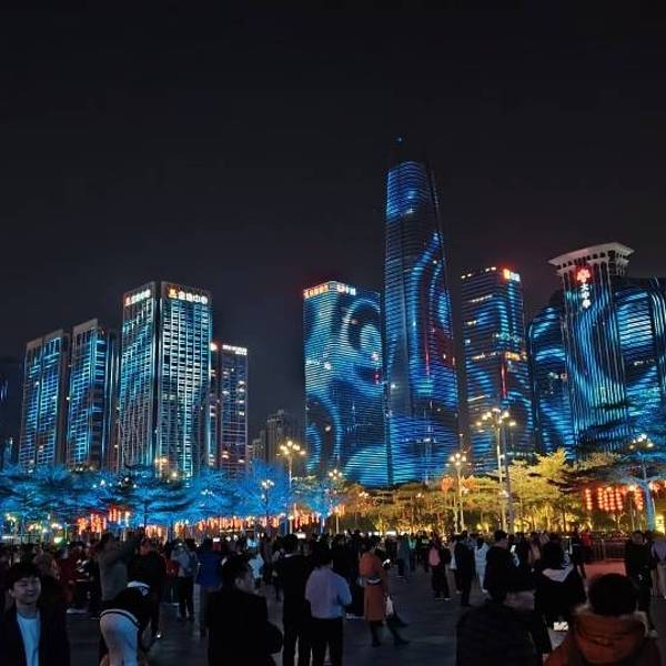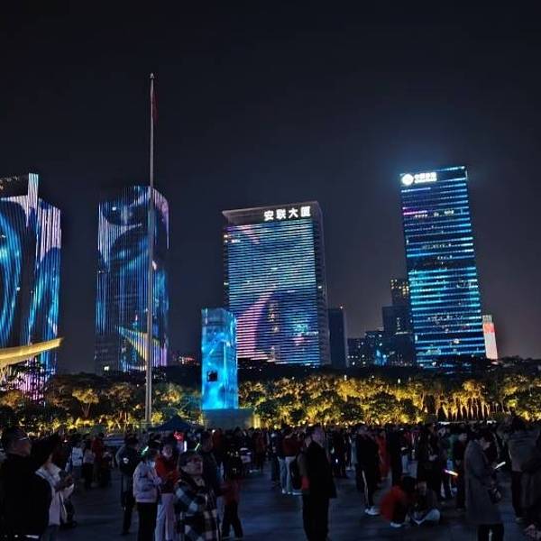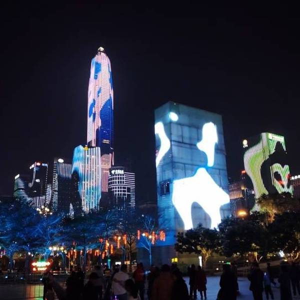 灯光秀一开始,整个深圳市民广场沸腾了。音乐声一起,广场周围一圈的高楼全部“动”了起来,出现同样的图案,太震撼了。