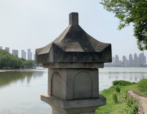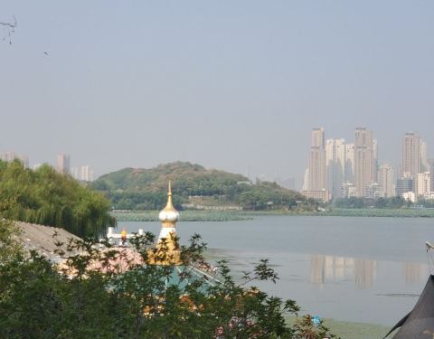 龟山下,塘岸水边有一个琴台月湖公园。 湖水波光粼粼。绿草茵茵。绿树茵茵。在这样一个武汉市的中心地区,有这样一大片绿色的青山绿水,真是当地老百姓的福气。