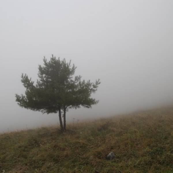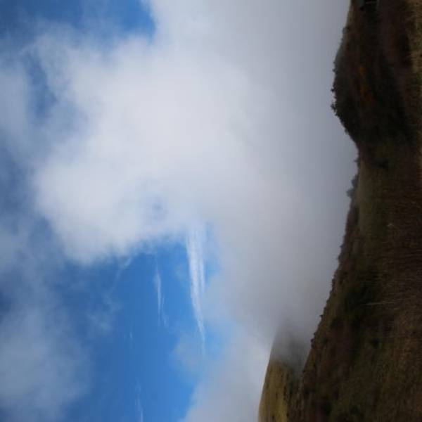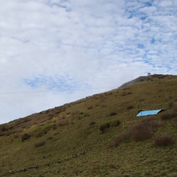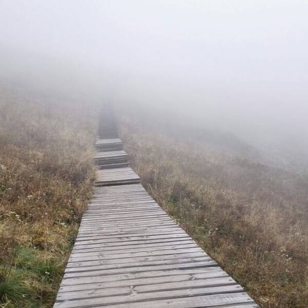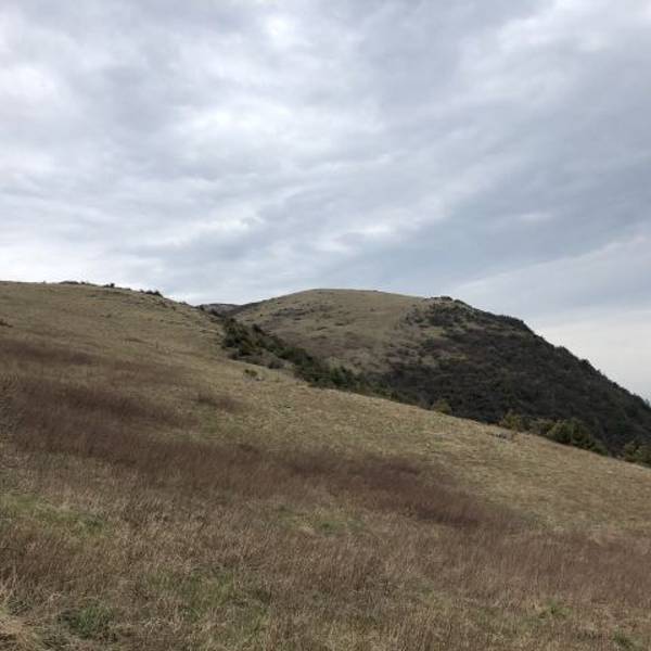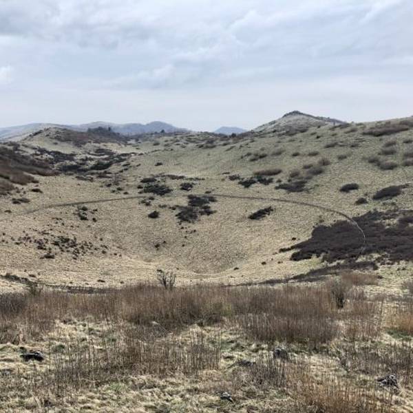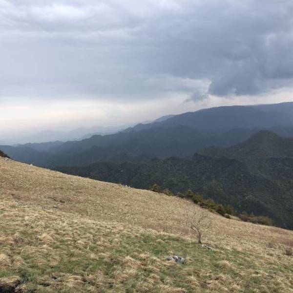 这一日的天气并不十分晴朗,天空时而短暂的透出蓝天,时而被厚厚的云层覆盖,时而又洒下些光来。山间明明暗暗,一瞬一瞬地变换着。顺着栈道一路向前,风景开阔了起来,大概因为海拔高的原因,山上的草甸还未完全变绿,再过一个月来大概风景会更美一些。