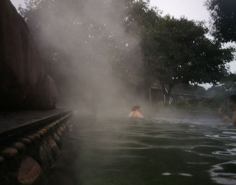 因为崖壁上长满了绿植,没有光秃秃的峡谷看起来震撼,这样的峡谷看起来更柔和因为下雨,第一天晚上基本就在吃烤羊、撸烤串、喝啤酒中度过了。第二天早上起来吃了个早饭,散了会步,闲着没事就去泡温泉了。