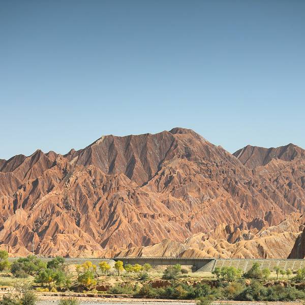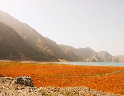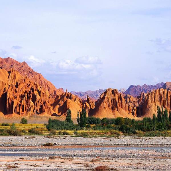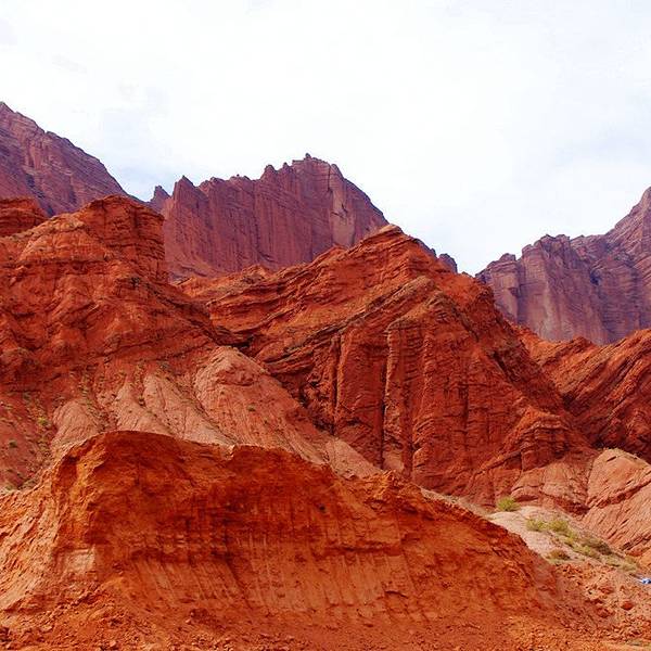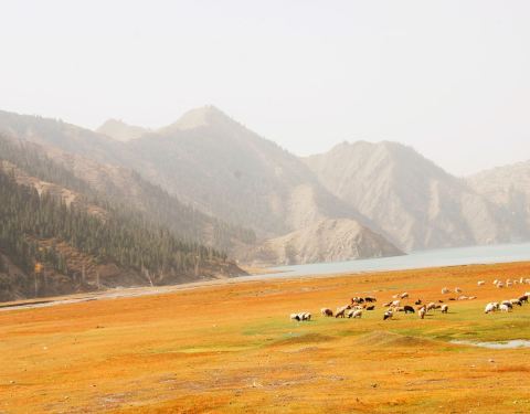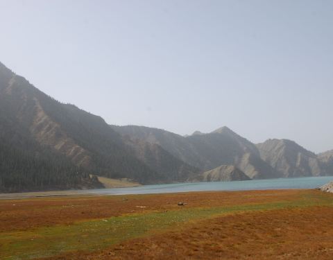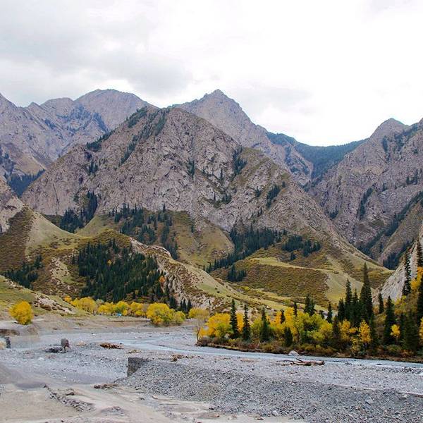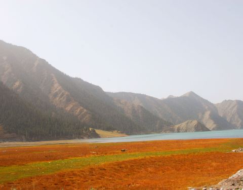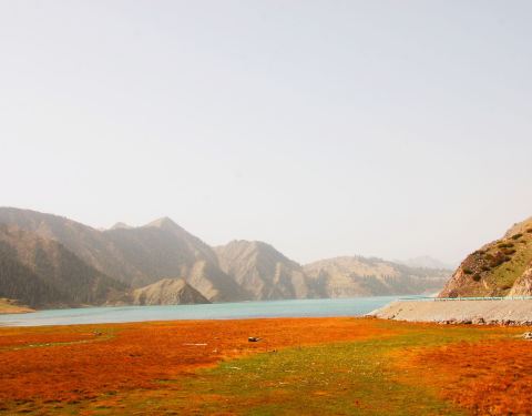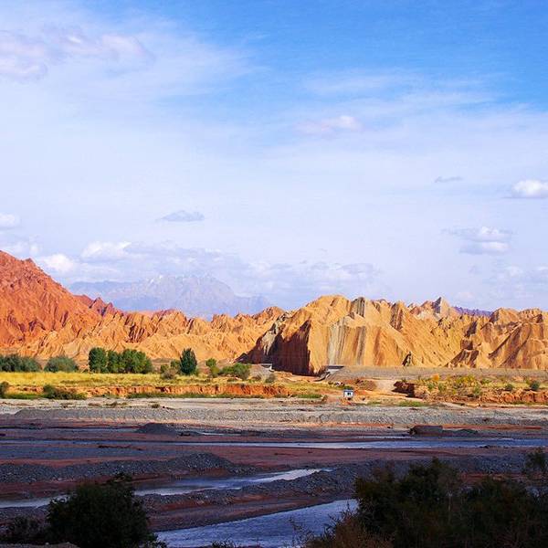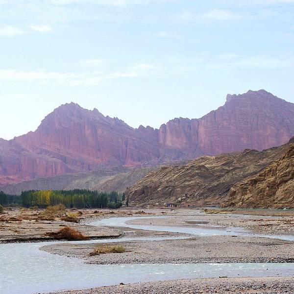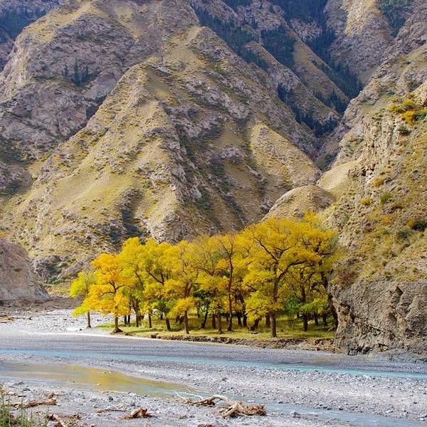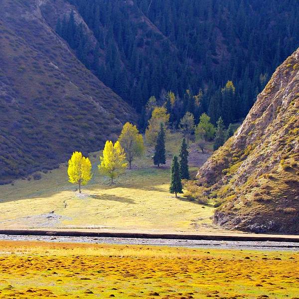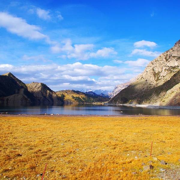 大峡谷的风光,美如图画,可惜道路很差,很多路段被水冲毁,难怪巴音布鲁克的司机说不好走呢穿过一个小村庄,路边出现了一个小湖,这就是大龙池。从大龙池眺望远处的天山群峰,风光优美,有如图画。阳光穿过云层,照耀着湿地和山间小树。回望来时的峡谷,我们已翻过了天山群峰。大龙池再往下不远,就是小...穿过一个小村庄,路边出现了一个小湖,这就是大龙池。从大龙池眺望远处的天山群峰,风光优美,有如图画。阳光穿过云层,照耀着湿地和山间小树。回望来时的峡谷,我们已翻过了天山群峰。大龙池再往下不远,就是小龙池,很小的一个湖,湖水很清,呈碧蓝色。小龙池边,花树怪石,倒映在湖中,有种精致的美。从小龙池一路下山,小河边偶尔还能看到一两户人家,住在这么与世隔绝的地方,颇有些隐居的味道。大峡谷的风光,美如图画,可惜道路很差,很多路段被水冲毁,难怪巴音布鲁克的司机说不好走呢。路边的牧民家庭,还没有出门放牧,羊圈里挤满了肥肥的绵羊,牧羊犬懒洋洋地躺在地上。幽深的河谷边,金色的树林,处处都能感受到浓浓秋意。我们遇到一个看守修路工地的大爷,告诉我们,今年七月底天山大峡谷发生了大洪水,冲毁了很多建设中的路面,差点死了人,满河谷都是大石头,现在还没办法重建。果然在损毁的路边,还有翻倒的大铲车。再往下游,河谷中的沙滩上,散落着很多洪水冲下来的树木残枝。一路往下,河谷变得开阔,前方出现了一大片红色山崖,这就是有名的天山红色大峡谷,又称克孜利亚大峡谷或库车大峡谷,山体呈砖红色,以红色岩石和粗砂砾岩组成。红色的山崖,犹如火焰升腾,我觉得这才像真正的火焰山。红色山崖,层层叠叠,叹为奇观。一路往南,红色的险峻山崖连绵不断,非常壮观。来到了库车大峡谷景区的入口,这里有一条5千米长的幽深红石峡谷,最宽处53米,最窄处0.4米,位于新疆库车县(古称龟兹)以北64公里处。峡谷已被开发为成熟的景区,购票方可进入。同伴们都不想进去了,我也不勉强,只在景区门口拍了几张照片。再往南走,河边还有大片的红色石林,怪石林立。一路沿着217国道往南,离库车县城还有20公里左右,我们向右拐上了省道,经拜城县去阿克苏市。
