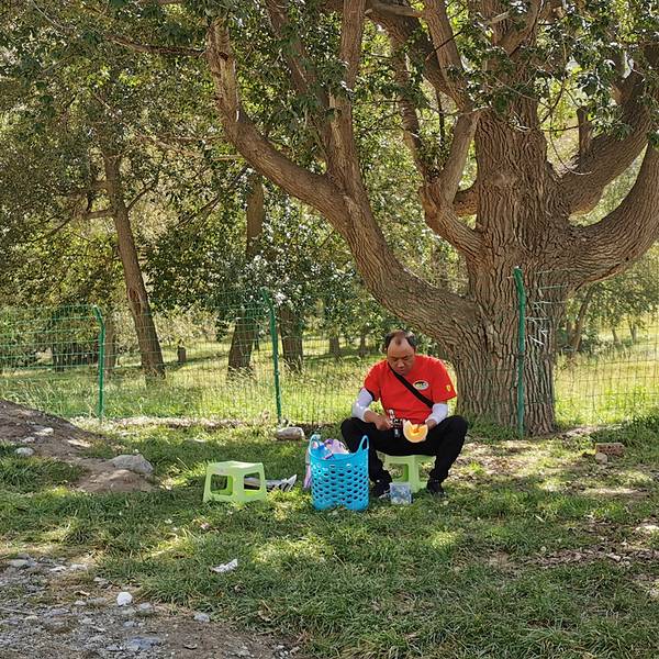 阳光灼热,外面的戈壁滩,一片明晃晃的白色,晒得我们实在受不了。早上在巴音布鲁克还冷得不行,这会儿又热得难耐。经过一个小乡镇,我们停车休息,去路边的小摊上吃烤包子,羊肉馅的,吃得一嘴油。 展开