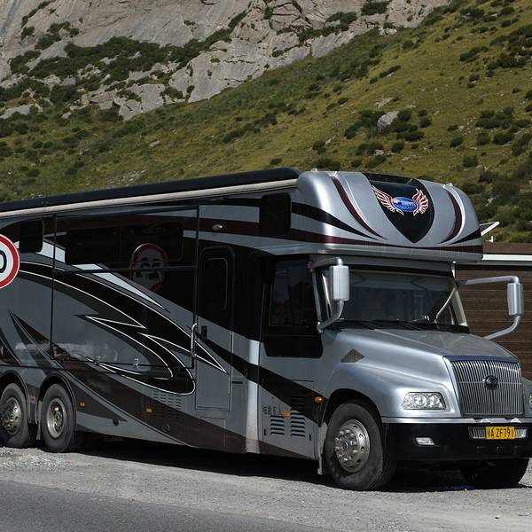 免费的景点。大龙池边上遇上一特大房车。因不便停车,在车上用手机打卡了事。现在,房车出行的人越来越多了小龙池。