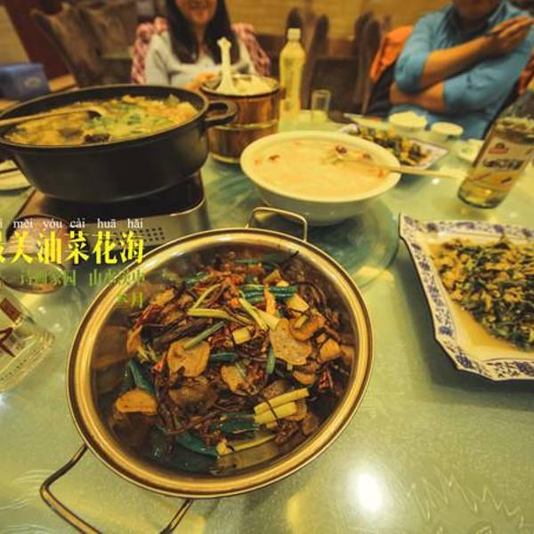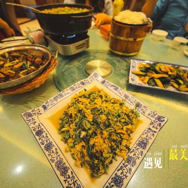 邀请陌生妹子为汉中带盐。哈哈。这里也是今年南郑油菜花海主打线路。而实际除了这个水库之外,对面上山的油菜花让人失望,只有很小的几片,建议南郑旅游局应该合理做一个规划,不要辜负大家的一片美好心意。今日的行程在这顿晚饭中结束。春芽炒鸡蛋也是本地特色菜,可能有的小伙伴吃不习惯,味儿太重,还有洋芋夹夹干锅(也就是土豆片晒干后在泡来炒)其他菜属于大众常见,这里就不说了。