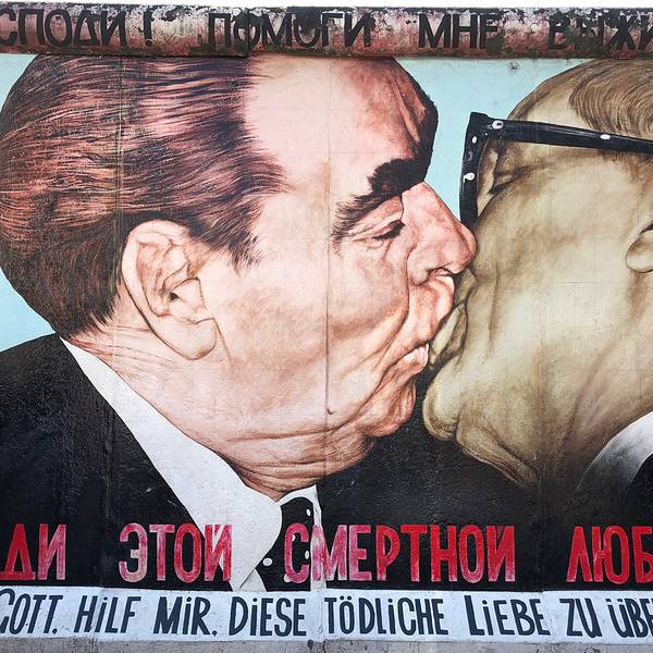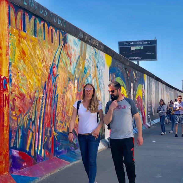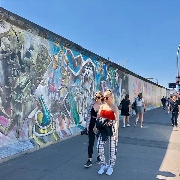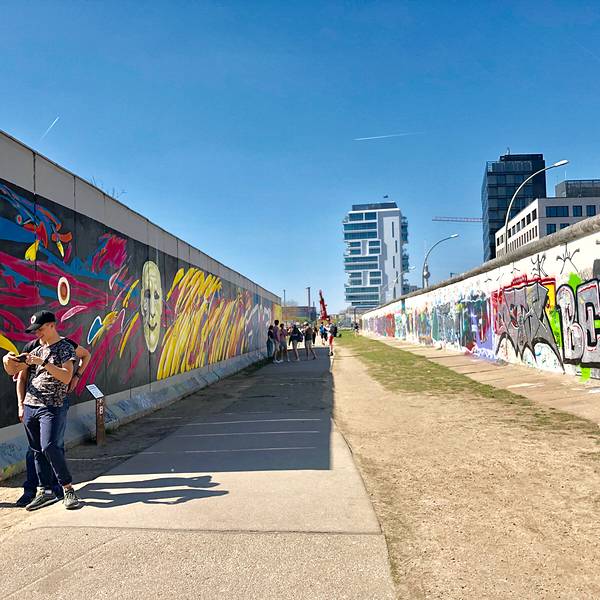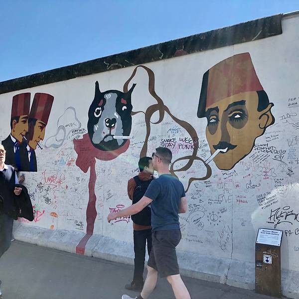 东边画廊是现存于柏林市内三段柏林墙中最长最著名的一段,是世界上最大的露天画廊,各国艺术家在墙上创作了不同主题的涂鸦绘画。墙上最著名的作品是画家弗鲁贝尔创作的《兄弟之吻》,涂鸦源于前苏联领导人勃列日涅夫与东德领导人昂纳克的会晤照片,这幅颇具冲击力且富含深意的画作反映出冷战时期的艺术家对政治与人性的深刻思考。除绘画外,墙上还有许多市民及游人写下的标语,内容千奇百怪,其中不乏有意思的中文口号,有兴趣的话可细细发掘。画廊西侧原属于西德部分的墙面涂鸦作品更为精美,东侧墙上的绘画则相对粗糙,景点附近还有很多售卖相关纪念品的小摊以供游览。